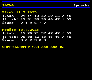 • Superjackpot (6 čísel + poslední číslo Šance) = průměrně 135 milionů Kč